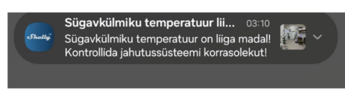 Süsteemis temperatuuri häire tuvastamisel saadetakse omanikule, vastutavale töötajale ja tehnikule telefoniteavitus: